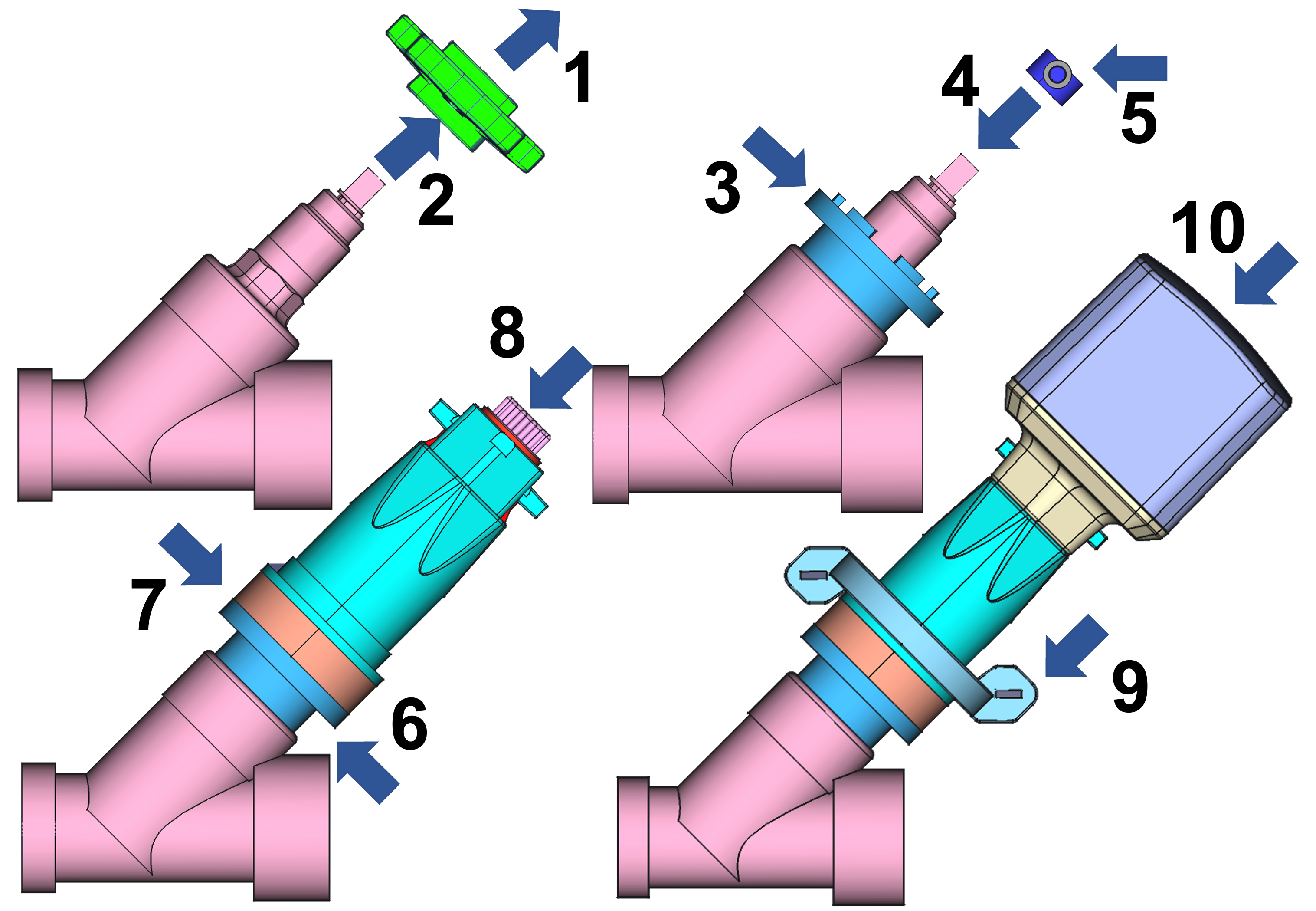 - Ventil manuell in die AUF-Position drehen, bevor der Motor erstmalig aufgesetzt wird. Die optimale AUF-Position ist ca. 2 Umdrehungen in Richtung ZU nach Erreichen des Anschlages in Richtung AUF (entgegen Uhrzeigersinn).