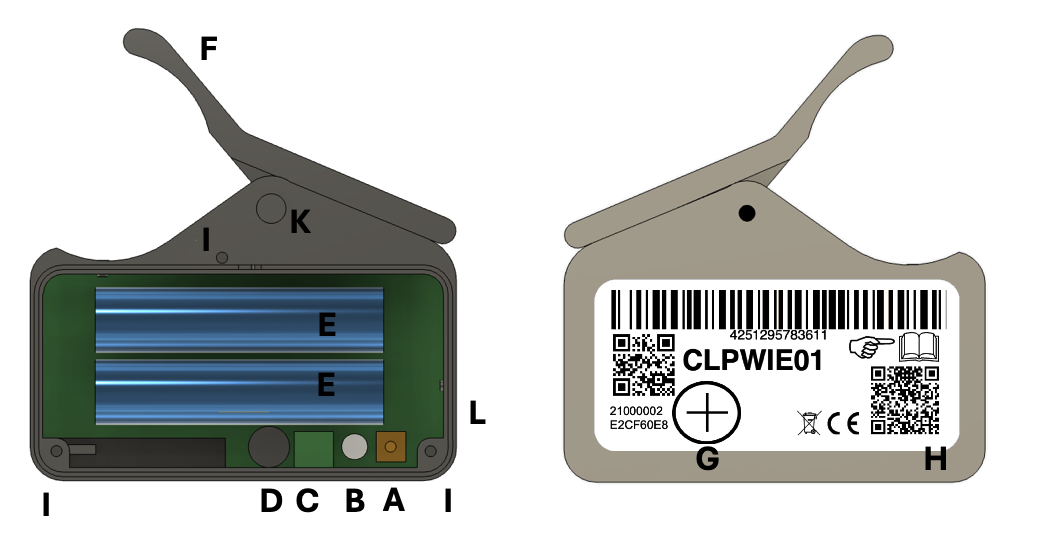 - Magnet entfernen: Sensor wird aktiviert – die rote LED (H) blinkt im Gehäuse (kann bis zu 1 Minute dauern)